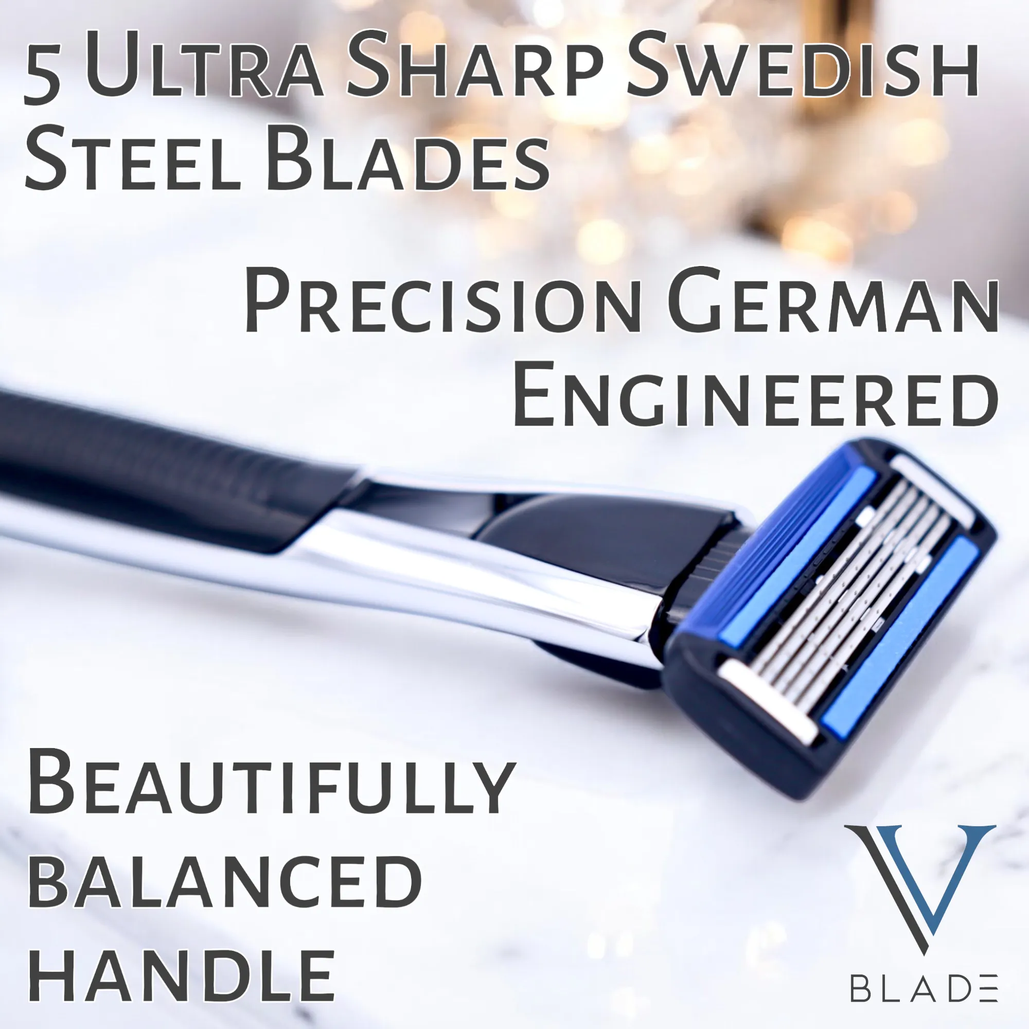 Perfectly balanced razor handle with 5 ultra sharp blades (refill blades available)