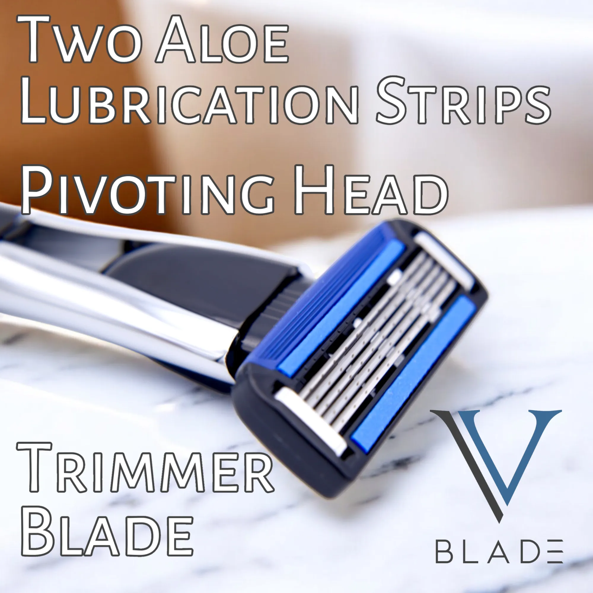 Blade cartridge has two Vitamin E and Aloe lubrication strips and precision trimmer blade.